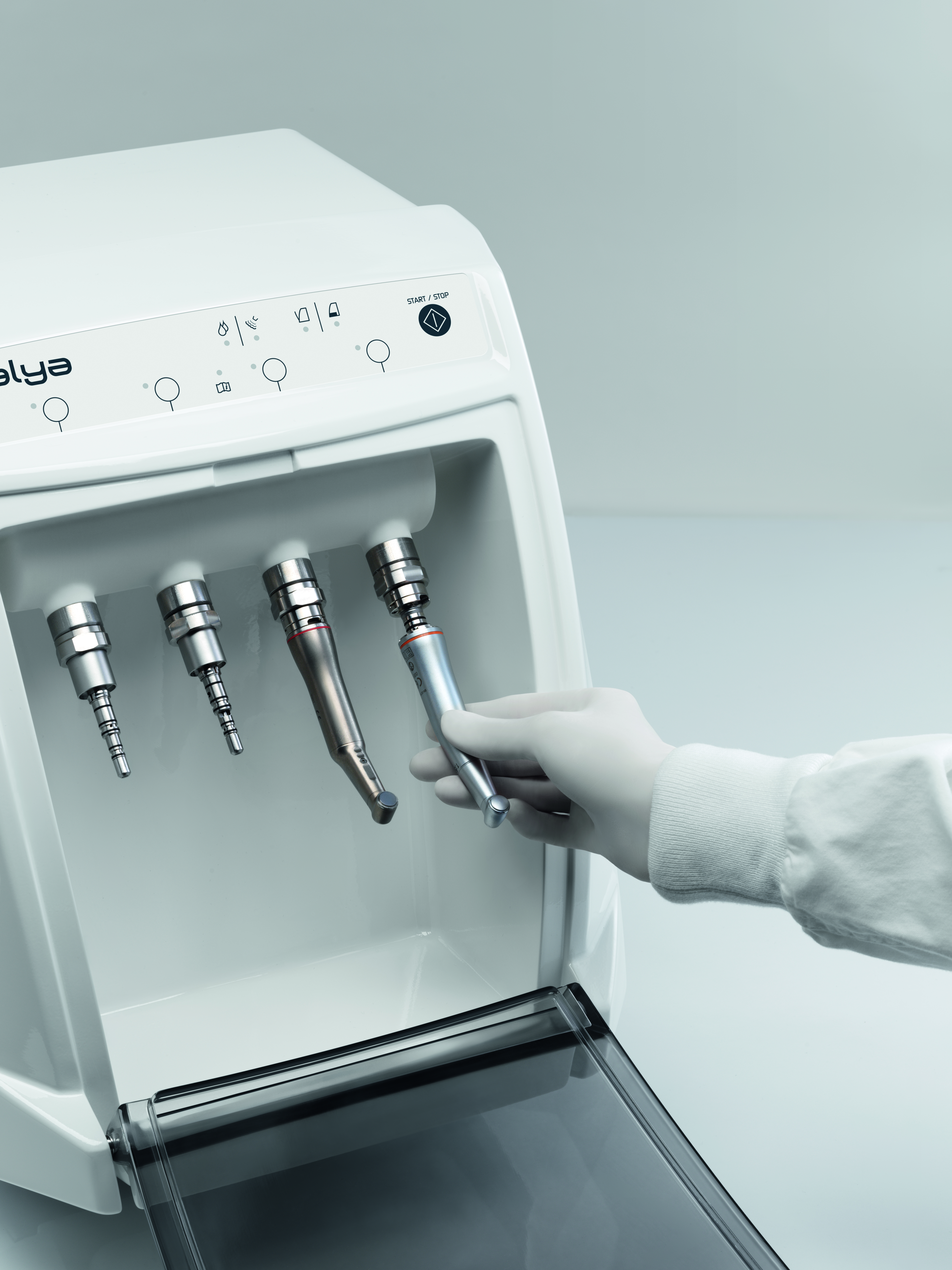 Utilizando el adaptador correspondiente, las piezas de mano para micromotor también girarán durante el tratamiento haciendo que el detergente, el desinfectante y el lubricante alcancen todos los puntos del instrumento.