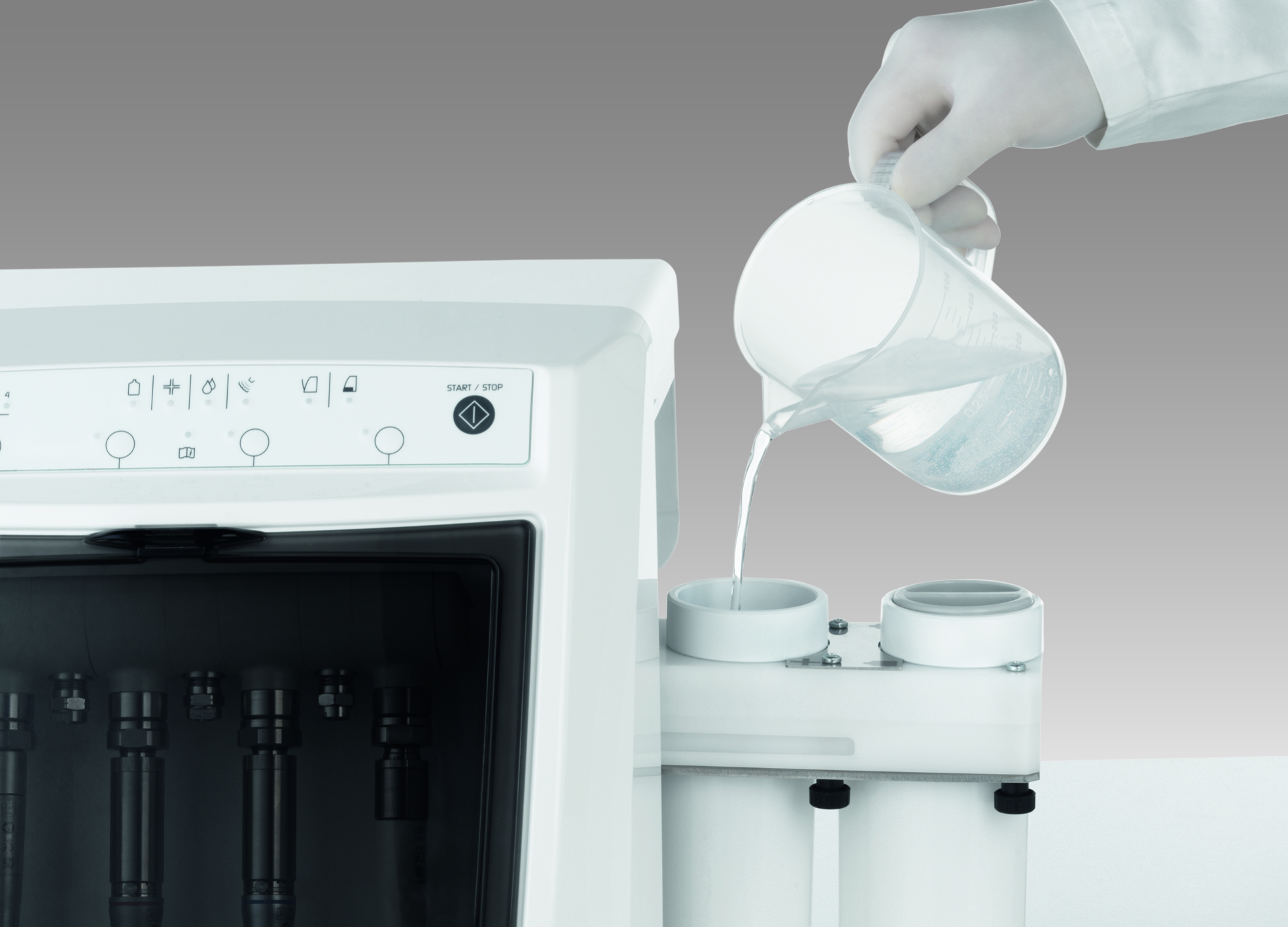 Thalya Plus utiliza un solo producto para las fases de limpieza y desinfección. La máquina está dotada de dos cómodos depósitos integrados situados en el lado derecho del dispositivo.