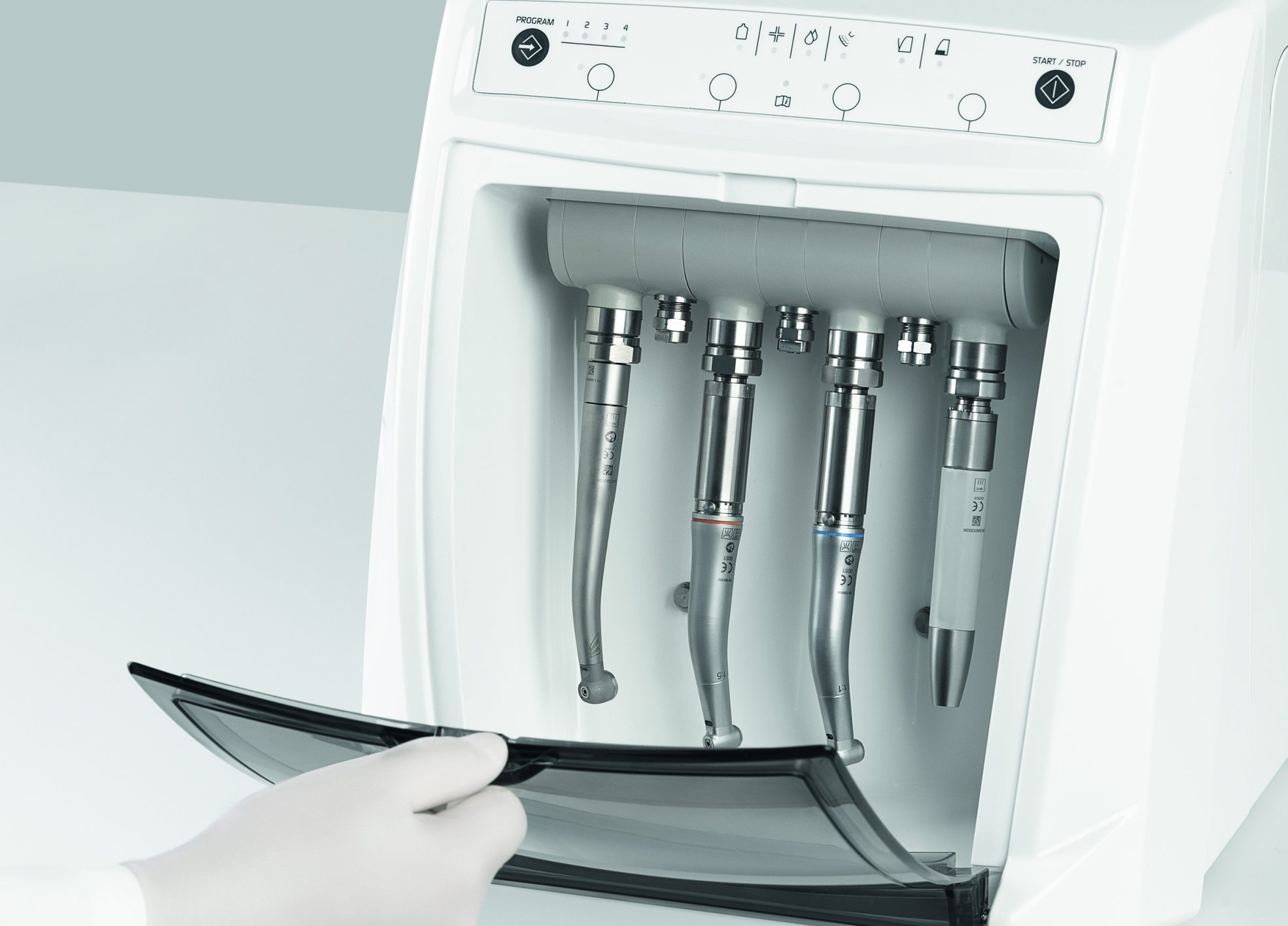 Utilizando el adaptador correspondiente, las piezas de mano para micromotor también girarán durante el tratamiento haciendo que el detergente, el desinfectante y el lubricante alcancen todos los puntos del instrumento.